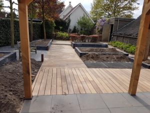 Complete tuin aangelegd! Hardhouten vlonder van ipé buitenparket, terras van tegels 50 x 50 cm antraciet, bloembakken gelijmd van strakke lineás 15 x 15 x 60 cm