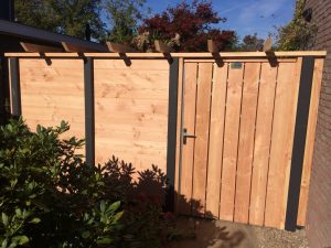 Blokhutprofielschutting douglashout met betonsleufpalen & betonplaten antraciet met coating afgewerkt met douglas bovenbalk & poort met verticale planken