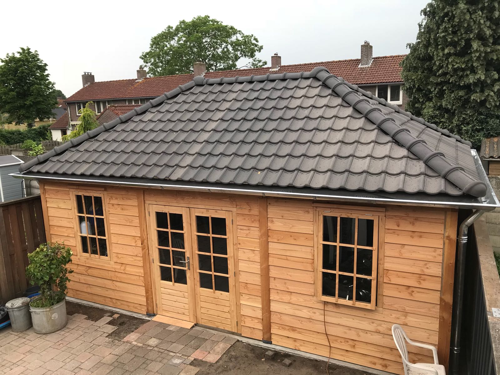 Douglas buitenverblijf geplaatst met pannendak en zinken goot, inclusief deuren & ramen van woodvision