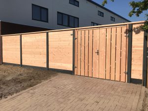 Frans blank doiuglas blokhutprofiel schutting, betonsleufpalen & betonplaten antraciet met coating. Douglas poort op stalen frame incl. hang-en sluitwerk