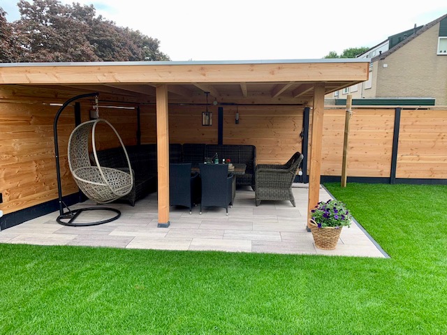 Tuin volledig voorzien van nieuwe bestrating, overkapping Frans blank douglashout inclusief dakbedekking, blokhutprofielschutting Frans blank douglashout met betonsleufpaal en betonplaten antraciet met coating