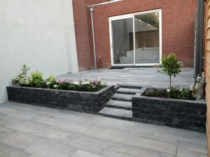 Tuin voorzien van nieuwe sierbestrating & platenbakken gelijmd van splitrocks inclusief trap