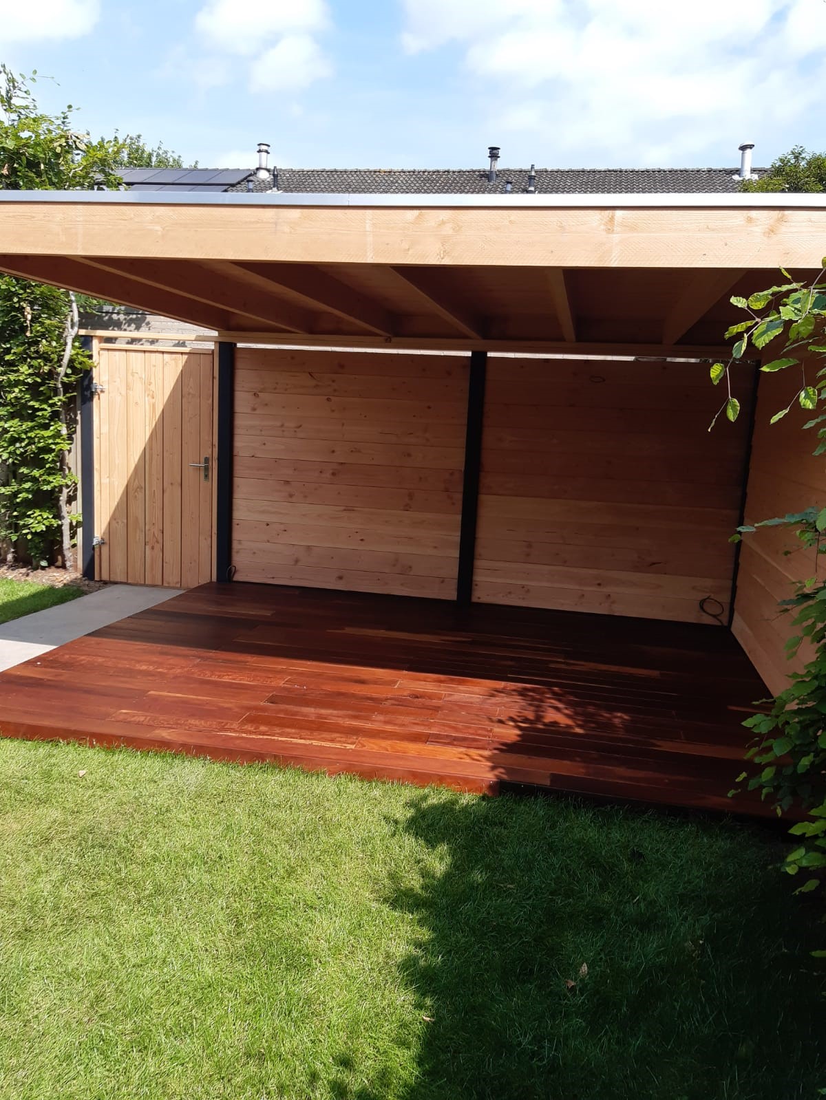 Douglas overkapping, poort, blokhutprofiel schutting en hardhouten vlonder (behandeld met lijnzaadolie)