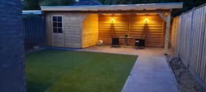 Douglas overkapping met tuinhuis, standaard schutting, keramische bestrating, kunstgras