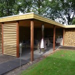 - Hardhouten cumaru vlonder (incl. hardhouten onderbalken & RVS vlonderschroeven) onder douglas overkapping (wand van douglas Zweeds rabat planken, staander geplaatst op een betonpoer antraciet)