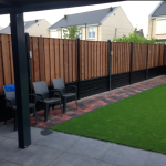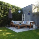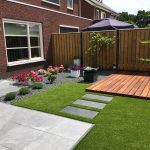 - Gehele tuin gerealiseerd in Valkenswaard met hardhouten schutting, Noord-Europees vuren schutting, hardhouten vlonder, siergrind Ardenner grijs en gras gelegd
