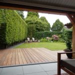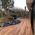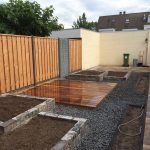 - Schutting standaard hout-beton met grindpanelen met hardhouten vlonder en bloembakken van getrommelde splitrocks