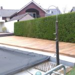 - Mooie hardhouten IPE vlonder langs een zwembad geplaatst, voorzien van onderbalken en RVS vlonderschroeven. Tevens is de tuin voorzien van een Noord-Europees vuren blokhutprofielschutting.