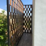 - Paneel van hardhouten stroken – verticaal bevestigd op frame met RVS schroeven tbv hardhout