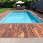 - Vlonder rond een zwembad gemaakt van ipé buitenparket, bevestigd op hardhouten onderbalken
