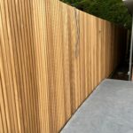 - Thermo Ayous schutting, planken verticaal bevestigd tegen hardhouten constructie