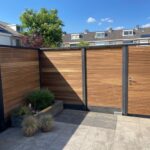- Geplaatst in Luyksgestel door onze vakmannen; Hardhouten schutting van Ipé stroken (blind gezet met hardhouten palen, RVS geschroefd, voorzien van betonbanden antraciet onderin