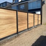 - Thermo Ayous schutting geplaatst tussen betonnen sleufpalen antraciet met coating (achterzijde)