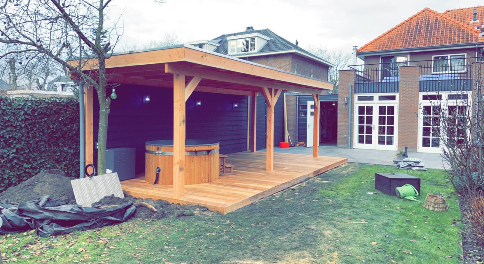 Hardhouten cumaru vlonder (incl. hardhouten onderbalken & vlonderschroeven, tevens ook mogelijk om de planken te bevestigen met B-fix clips) + douglas overkapping incl. bitumen dakbedekking