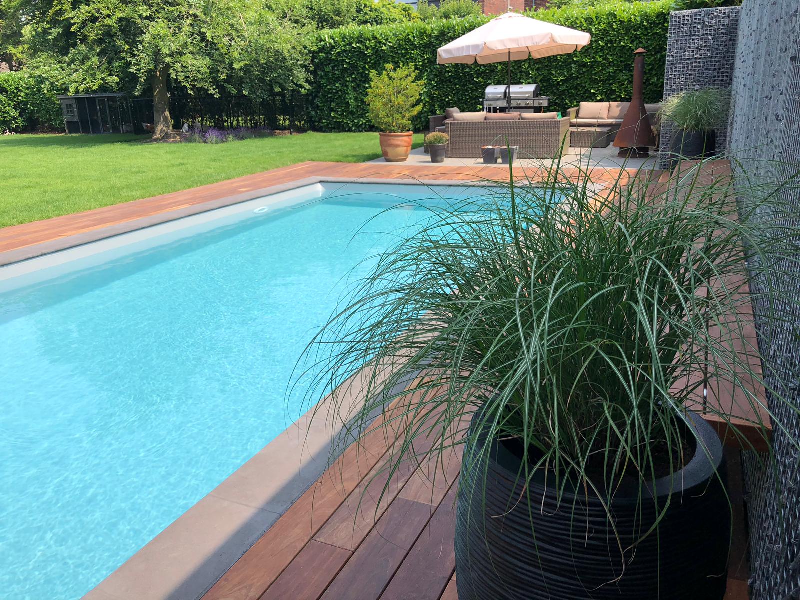 Vlonder rond een zwembad gemaakt van ipé buitenparket, bevestigd op hardhouten onderbalken