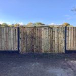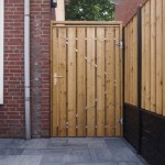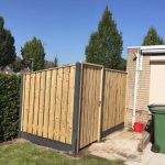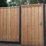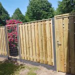 - Noord-Europees vuren schutting met lichtgrijze palen en poort op stalen frame