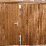 - Dubbele poort noord-europees geïmpregneerd vurenhout op stalen frame inclusief hang- en sluitwerk tussen 2 muren geplaatst.