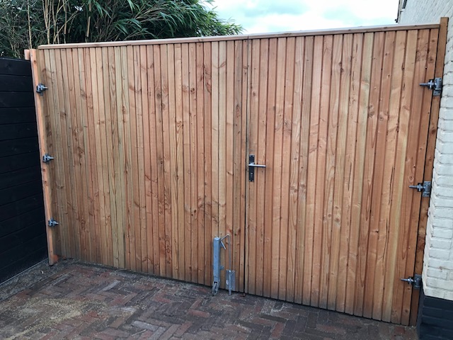 Geleverd in Westerhoven; Dubbele douglas poort van Rhombusprofielplanken inclusief hang- en sluitwerk en poortwiel