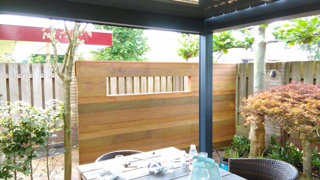 Wand van IPE hardhout voorzien van opening geplaatst en geleverd in Leende