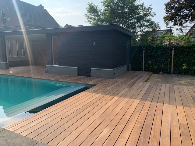 Overkapping met zwarte planken en een hardhouten vlonder van Cumaru FAS planken rondom een zwembad