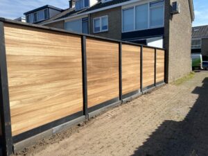 Thermo Ayous schutting geplaatst tussen betonnen sleufpalen antraciet met coating (achterzijde)