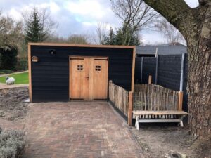 Door daamswp|2021-07-26T16:45:14+02:0022/07/2021|Reacties uitgeschakeld voor Door een klant gerealiseerd; Tuinhuis met douglas staanders & deuren, wanden zijn voorzien van geïmpregneerd vuren zwart Zweeds rabat planken. Tevens is er een kastanje hekwerk geplaatst