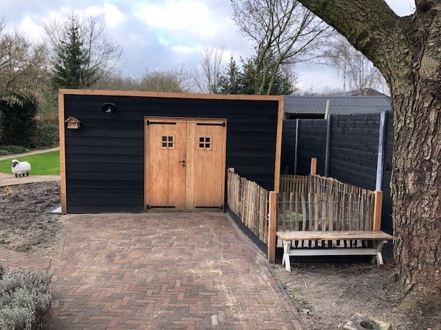 Door een klant gerealiseerd; Tuinhuis met douglas staanders & deuren, wanden zijn voorzien van geïmpregneerd vuren zwart Zweeds rabat planken. Tevens is er een kastanje hekwerk geplaatst