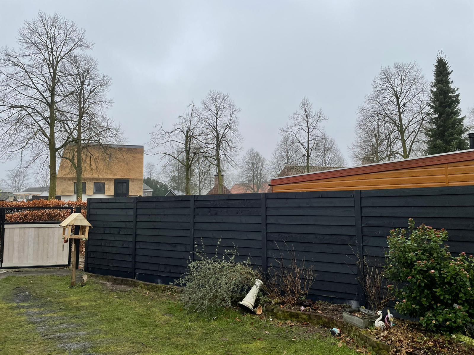 Zwart zweeds rabat schutting (panelen, dubbelzijdig of enkelzijdig mogelijk) met betonpalen & betonplaten antraciet gecoat